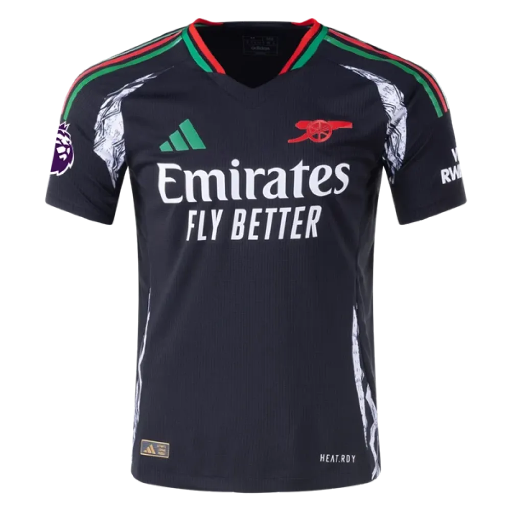 Description: Arsenal‘s 24/25 season away jersey is mainly in mysterious black, with striking red and green lines, just like the Gunners under the night sky, ready to go. This jersey pays tribute to the club’s legendary stars David Rocastle and Ian Wright, whose passion and vitality are perfectly interpreted in this jersey. Wear it, you are a member of the Gunners, ready to fight for victory at any time!These cheap jerseys are available in the bstjersey online store, and customers are welcome to purchase them.